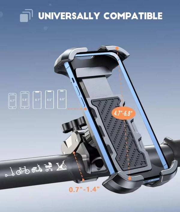 Breite Kompatibilität: Diese universelle Handyhalterung für Fahrradzubehör ist für Geräte mit einer Größe von 4,7 bis 6,8 Zoll und einer Dicke von bis zu 0,59 Zoll (15 mm, inklusive Handyhülle) geeignet, wie z. B. iPhone 16, iPhone 16 Plus, iPhone 16 Pro, iPhone 16 Pro Max, iPhone 15, iPhone 15 Plus, iPhone 15 Pro, iPhone 15 Pro Max, iPhone 14 13 Pro Max, 12 Mini, Xs XR X 8 Plus 7 6s 6, Galaxy S24 23 22, Note 9, LG und andere Handys.